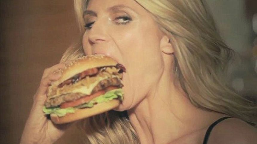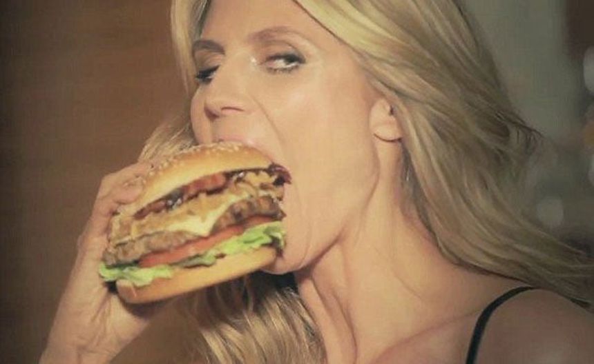 La top model, Heidi Klum participó en la campaña publicitaria de una cadena de restaurantes de comida rápida, en donde, de manera muy sexy, devora una gran hamburguesa mientras seduce a su próxima víctima.
