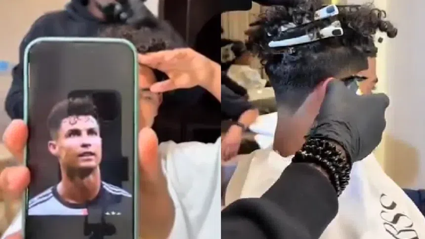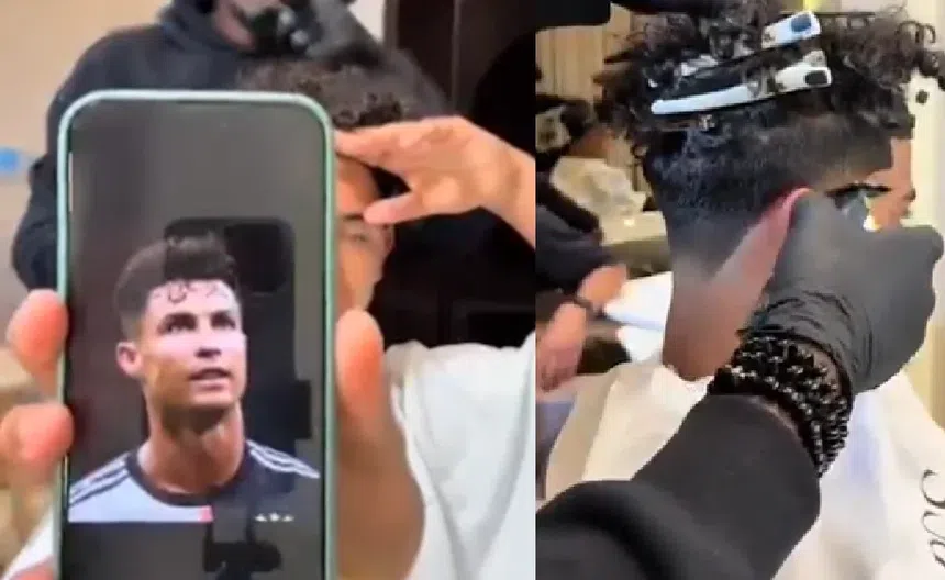El juvenil con el barbero sin antes mostrar el corte que quería y de inmediato mostró una imagen del actual jugador de Al-Nassr aunque en esa época vistiendo los colores de la Juventus.