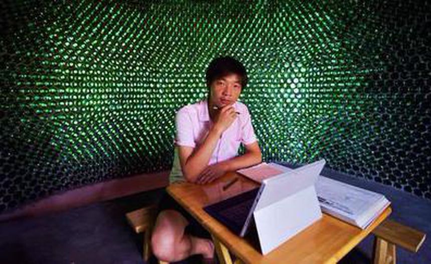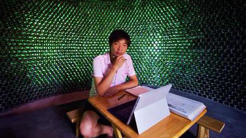 El arquitecto chino Li Rongiun elaboró una oficina con 8 mil 500 botellas de cerveza reutilizadas, en la localidad de Chongqing.