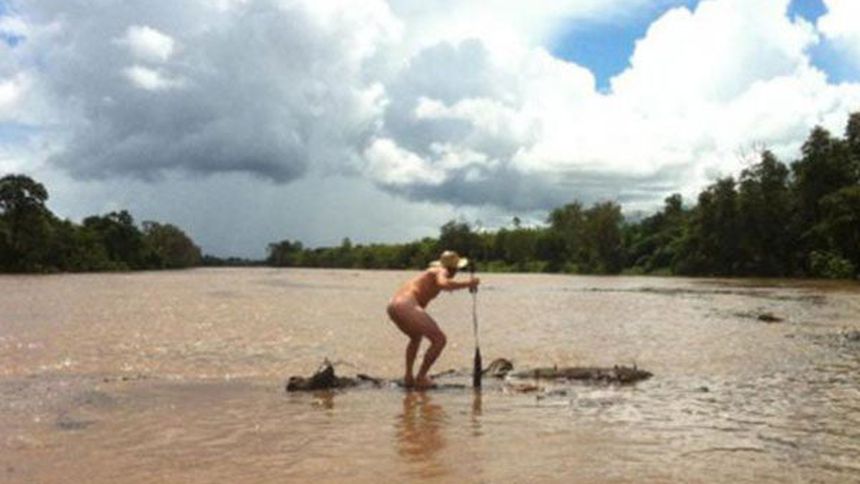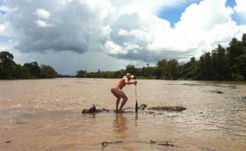 Un australiano, desnudo, y borracho, usando sólo un sombrero para el sol, arriesgó su vida para ganar dos cajas de whisky, por cruzar un río lleno de cocodrilos.