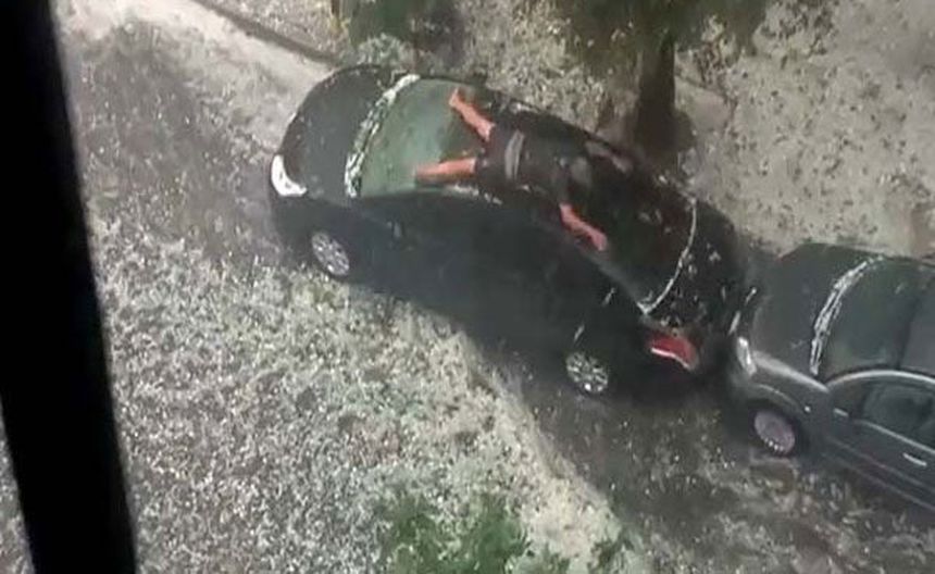 Hombre nada sobre su auto en pleno granizo