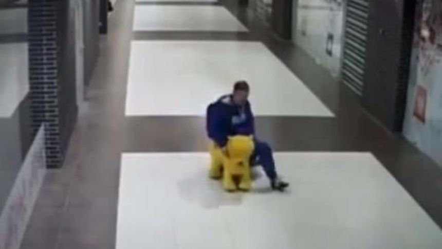 Con toda la calma y tranquilidad del mundo, un hombre salió por la puerta de un centro comercial en Bielorrusia a bordo de un Winnie Pooh de juguete y sin que nadie le dijera nada, huyó.