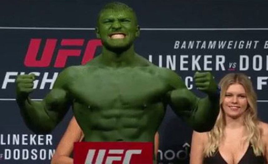 Ion Cutelaba, peleador de artes marciales mixtas, llegó a la ceremonia de pesaje con todo el cuepo pintado de verde previo al enfrentamiento que tendrá contra Jonathan Wilson en la UFC.