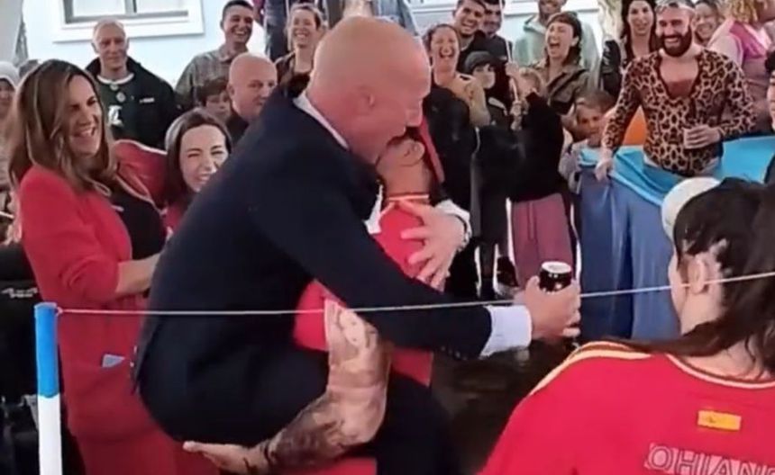 En medio del acto, se percibió el primer momento chusco, cuando la imitadora de Jenni Hermoso se acercó al de Luis Rubiales. La jugadora cargó al presidente de la Real Federación Española de Futbol y luego, sin más, recrearon el polémico beso de la vida real.