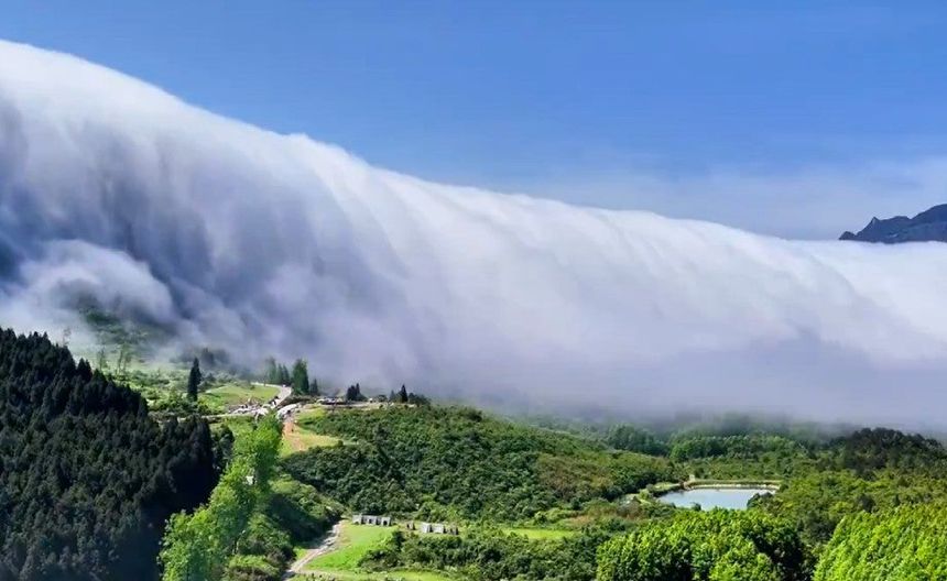 Este espectáculo atmosférico crea la ilusión de que las nubes fluyen por las montañas como si fueran una cascada de agua, generando un paisaje surrealista y hermoso que cautiva a quienes lo observan.