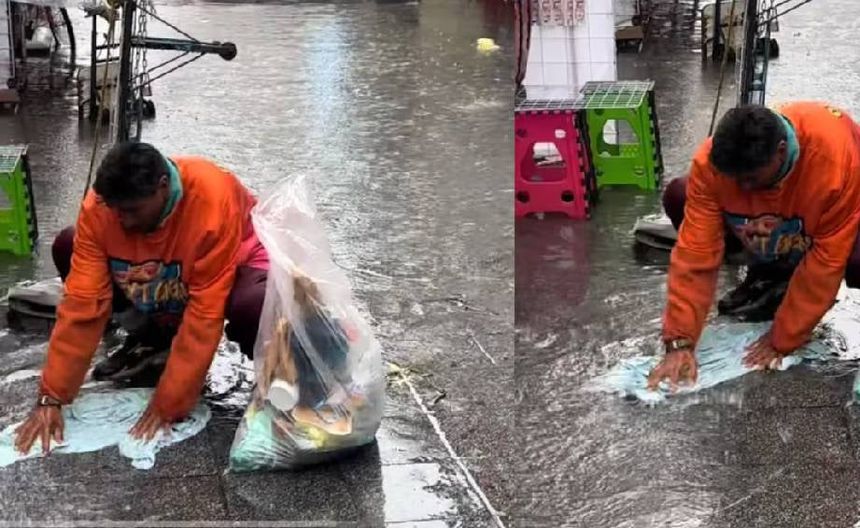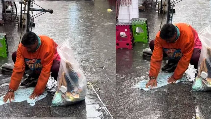 En TikTok hay un video viral que muestra calles inundadas con puestos callejeros al fondo. En la escena, un joven está barriendo la basura mientras un hombre lava su ropa a un lado. El hombre sostiene una bolsa llena de prendas y con fuerza talla una pieza de ropa en la banqueta mojada por la tormenta. Se puede apreciar su determinación al tallar la ropa y darle la vuelta para lavarla por ambos lados.