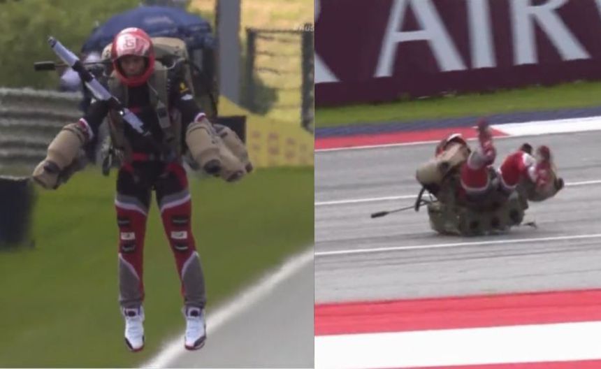 Un "hombre volador" protagonizó un momento de angustia previo al arranque del Gran Premio de Austria cuando se estrelló repentinamente al tratar de aterrizar su jetpack mientras realizaba un show para los espectadores de la carrera.