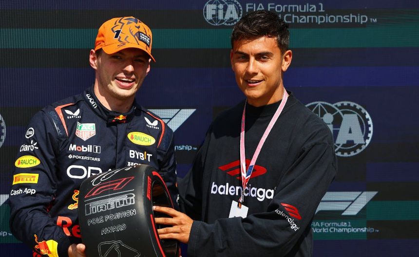 ¡Invitado de lujo! Paulo Dybala fue el encargado de darle el trofeo de pole a Max Verstappen