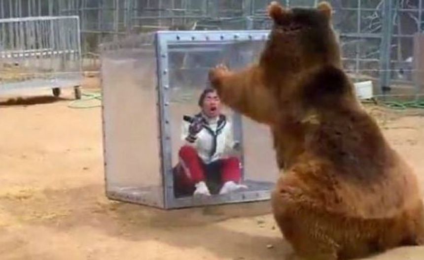 La prueba consiste en que una concursante se mete a un gran cubo protegido y graba las acciones mientras es atacado por un oso salvaje.