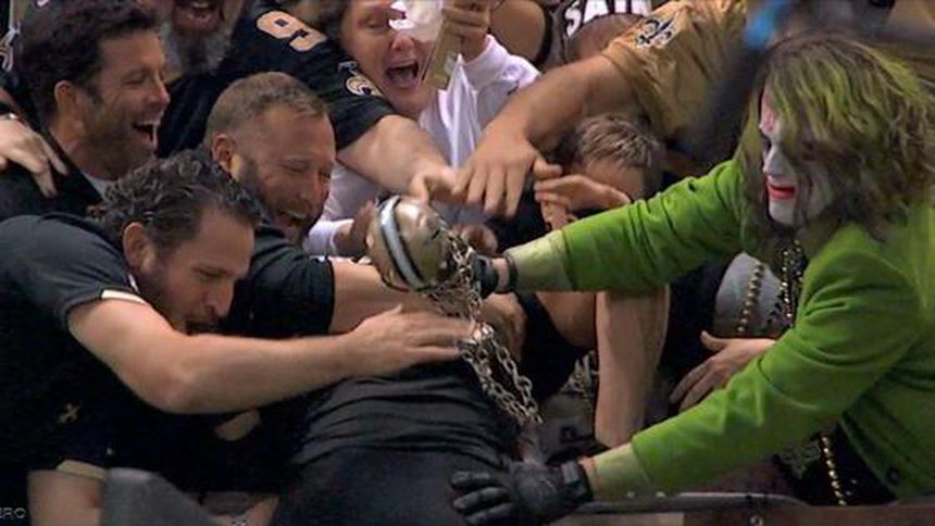 El ala cerrada de los Santos de Nueva Orleans, Jimmy Graham, fue manoseado por un aficionado, disfrazado del 'Guasón', tras saltar a la tribuna para celebrar sus touchdowns en el encuentro en casa contra los 49ers de San Francisco.