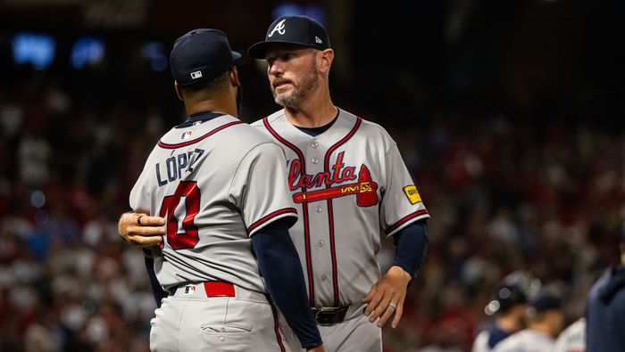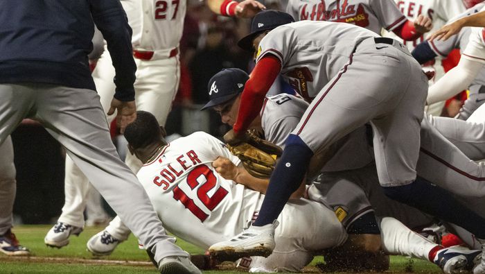 Jugadores y entrenadores salieron en tropel de las bancas y de los bullpens, y el mánager de los Bravos Walt Weiss derribó a Soler, el Jugador Más Valioso de la Serie Mundial de 2021 con Atlanta.