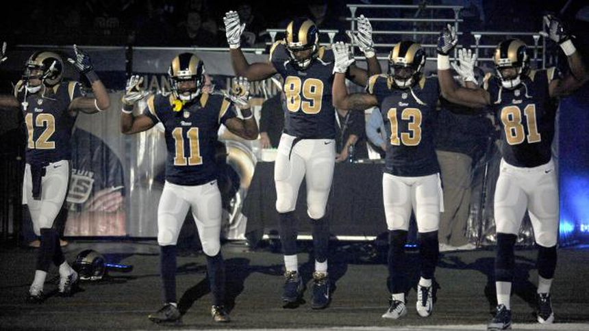 Cinco jugadores de los Carneros armaron tremendo revuelo al levantar sus brazos cuando salían al terreno de juego en señal de solidaridad con las protestas que tienen lugar en Ferguson por la muerte de un joven afroamericano en manos de un policía blanco.