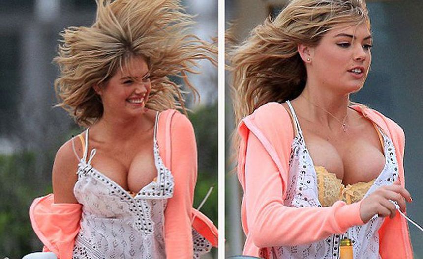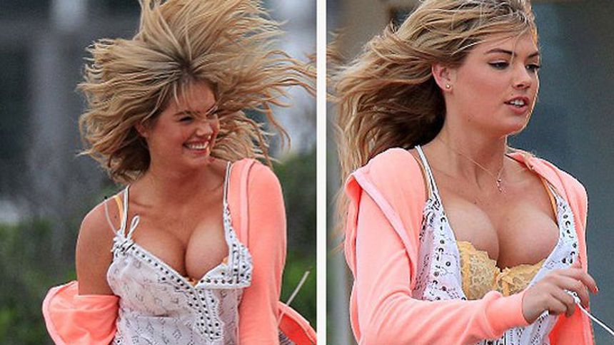 Kate Upton estuvo a punto de sufrir un accidente con su amplio escote, mientras brincaba en el set de filmación de la película ';The Other Woman';.