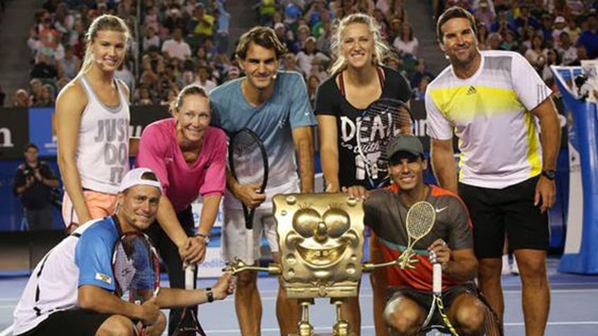 El australiano Lleyton Hewitt, la canadiense Eugenie Bouchard, la australiana Samantha Stosur, el suizo Roger Federer, la bielorussa Victoria Azarenka, el español Rafael Nadal y el australiano Patrick Rafter dieron un partido de exhibición en el Melbourne Park, donde arrancaron las sonrisas de los aficionados más pequeños al deporte de las raquetas.