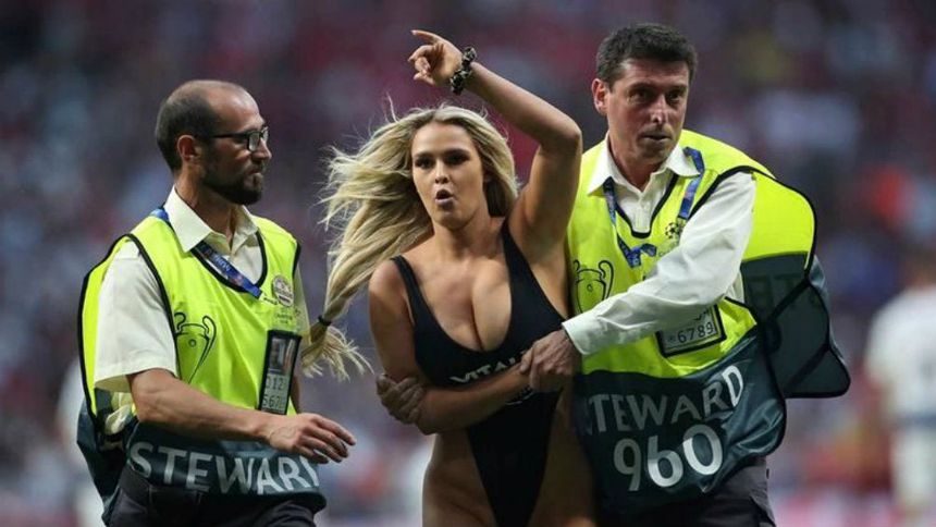 La pareja buscaba promocionar nuevamente el sitio Vitaly Uncensored, una página para adultos de Zdorovetskiy; sin embargo, fue tacleado por guardias de seguridad del estadio.
