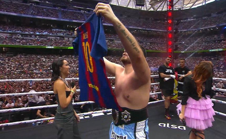 El boxeador salió con los puños en los más alto y tras el anunció final y con el cinturón de campeón fajado en la cintura. El pugilista sacó el jersey de Messi con el Barcelona para recordar el momento icónico que hiciera famoso la propia ‘Pulga’.