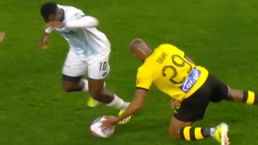 La acción fue cometida por Djibril Sidibé del AEK Atenas, compañero de Orbelín Pineda y Pizarro que al minuto 76 con tal de evitar un contragolpe en contra de su equipo, le quitó el balón al rival y trato de fingirlo tirado en el césped, pero en esta ocasión el silbante si sancionó la falta.