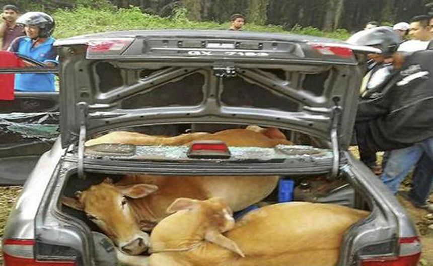 Después de doparlas, los ladrones lograron meter cuatro vacas en la cajuela de un auto.