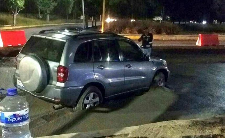 La camioneta de la mujer queda atorada en el cemento | @RACSO_1856