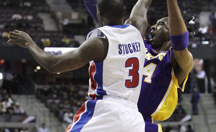 Rodney Stuckey anotó 34 puntos y los Pistons de Detroit se sobrepusieron al tiro de Kobe Bryant que empató el marcador al terminar el tiempo reglamentario para finalmente vencer el martes por 88-85 a los Lakers de Los Ángeles.