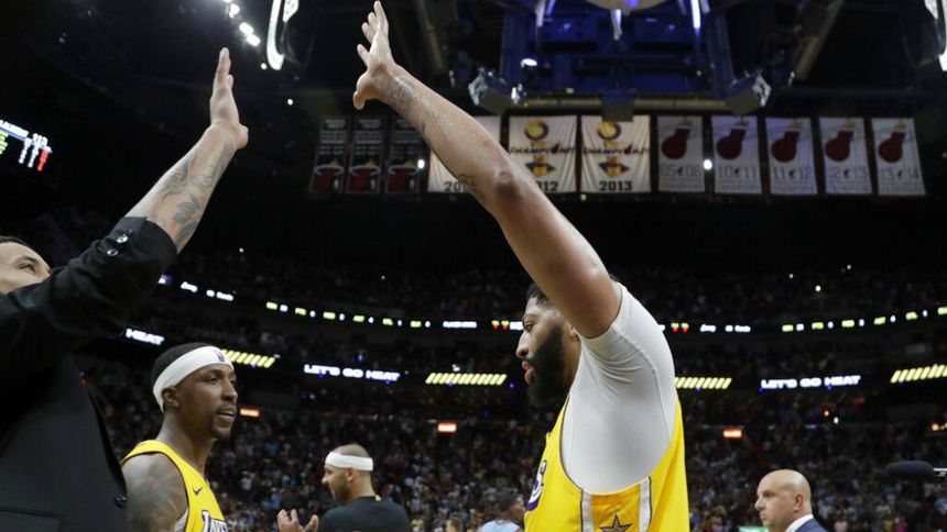 Anthony Davis anotó 33 puntos, LeBron James 28, que se quedó a un rebote para un triple-doble, y los Lakers defendieron su ventaja para doblegar 113-110 al Heat de Miami.