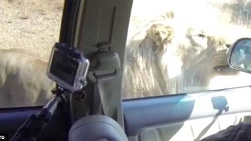León 'ataca' automóvil de turistas en Sudáfrica
