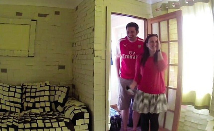 Una pareja de Inglaterra se llevó una gran sorpresa al volver a su casa, luego de su luna miel. Y es que cada rincón haba sido cubierto por aproximadamente 14 mil notas de Post it.