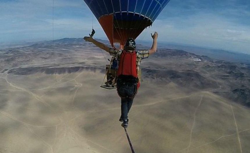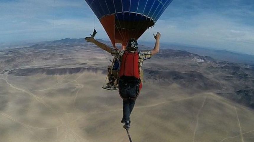 Andy Lewis volvió a desafiar a la gravedad y el equilibrio al imponer un nuevo récord de caminar sobre una cuerda a más de mil 200 metros del suelo, sujetada entre dos globos aerostáticos.