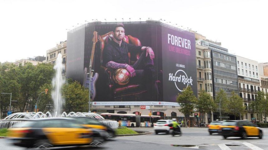 El argentino aparece con uno de sus balones de oro y una guitarra eléctrica en una lona con aproximadamente 20 metros de largo y con el patrocino principal de Hard Rock.