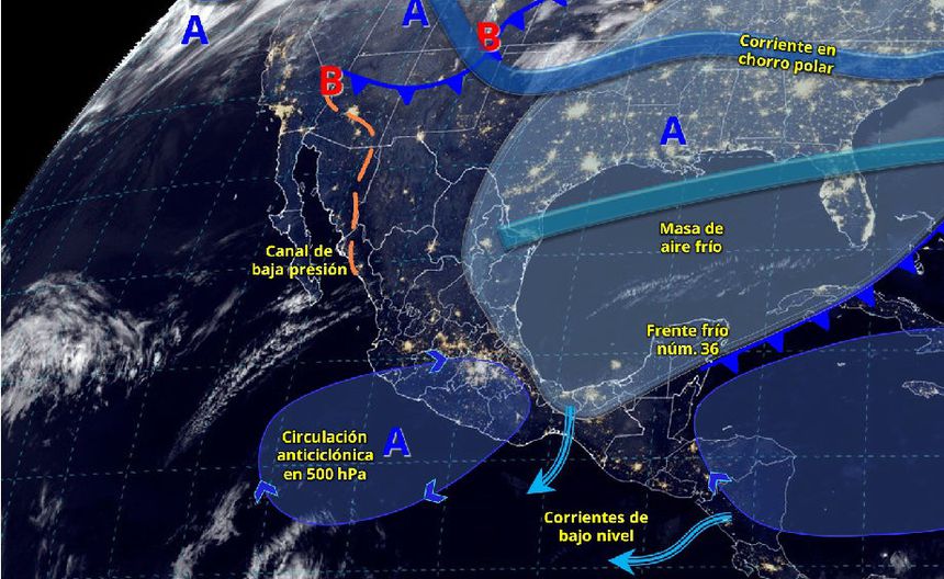A comparación del reporte del pasado jueves, para hoy la dependencia espera que una circulación anticiclónica y el bajo contenido de vapor de agua mantendrán la baja probabilidad de lluvia en la mayor parte del país