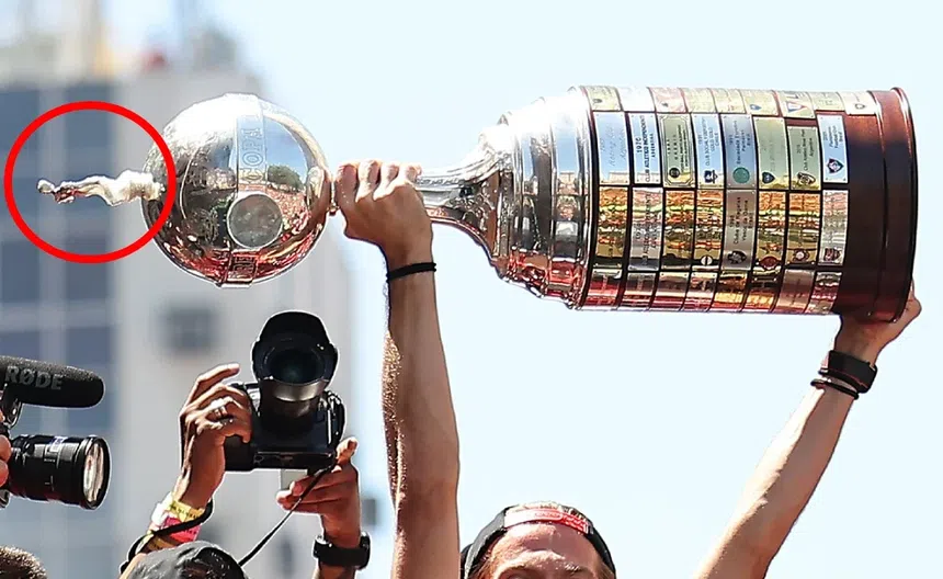 La celebración por la cuarta Copa Libertadores de Flamengo dejó una imagen inesperada en medio de la euforia. Durante el multitudinario festejo en Río de Janeiro, el trofeo que portaba el equipo apareció visiblemente dañado, con la figura superior sostenida por una cinta adhesiva. De acuerdo con los reportes, una parte de trofeo terminó rota y siendo pegada por cinta adhesiva, lo que llamó la atención de los aficionados que acompañaban el recorrido del equipo campeón.