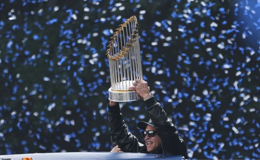 El mánager Dave Roberts levantó el Trofeo del Comisionado mientras estaba a bordo de uno de los varios autobuses que recorrieron una ruta llena de fanáticos vestidos de azul que agitaban banderas y vitoreaban. "B dos B" se leía en uno de los muchos carteles escritos a mano que sostenía la multitud.