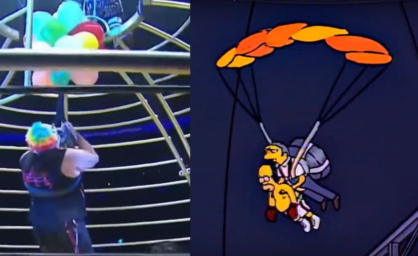 En dicho episodio a pesar de que Homero no se va flotando gracias a unos globos, si es rescatado por su amigo Moe con un artefacto que lo eleva encima del ring para evitar seguir siendo golpeado, muy similar a lo que pasó con Murder Clown, quien fue rescatado por su compañero Panic Clown.