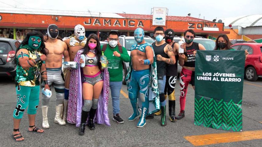 El tradicional mercado de Jamaica de la Ciudad de México se transformó en una arena de lucha libre en donde los enmascarados fueron a exigirle tanto a clientes como comerciantes que se colocaran en todo momento el cubrebocas para reducir el riesgo de contagio dentro del inmueble.