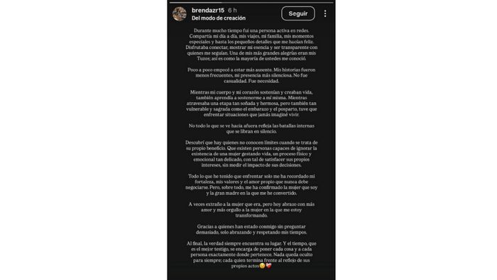 A través de una historia en su perfil personal, Brenda compartió un texto donde detalló haber atravesado periodos de ausencia en redes sociales debido a procesos personales. En el escrito, señaló haber enfrentado situaciones inesperadas y "batallas internas que se libran en silencio".