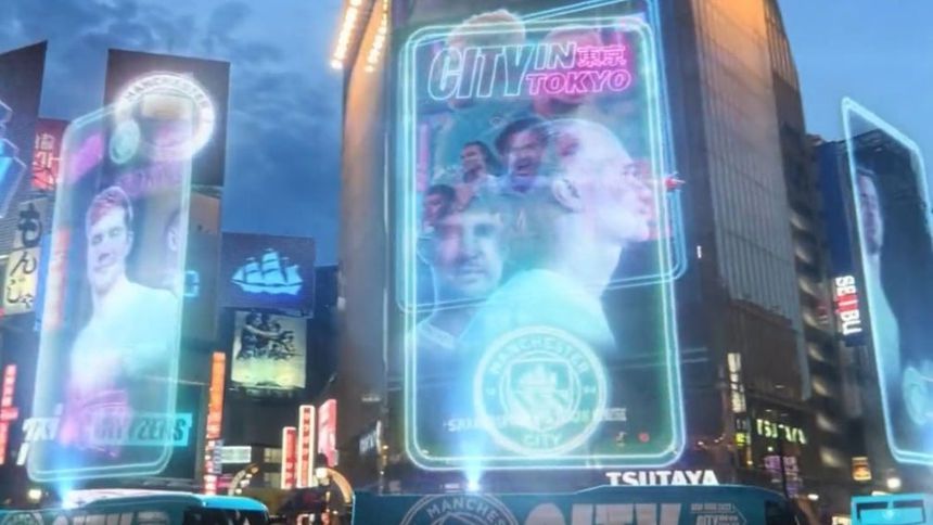 Manchester City, actuales campeones de Premier, Champions League y FA Cup, promocionó su gira por Tokyo con hologramas en las calles del país asiático.