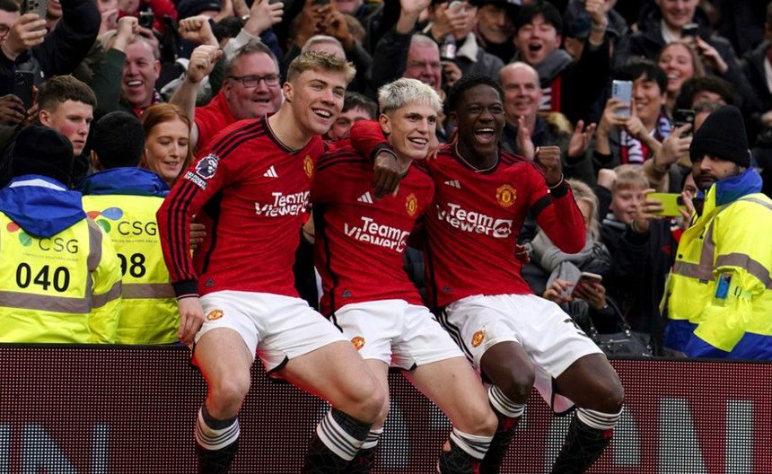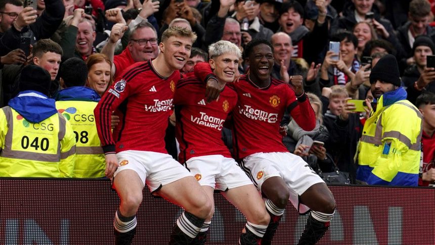 Alejandro Garnacho anotó el segundo gol del Manchester United, se subió a un cartel publicitario e hizo una seña a Rasmus Hojlund y Kobbie Mainoo para que se sentaran a su lado.