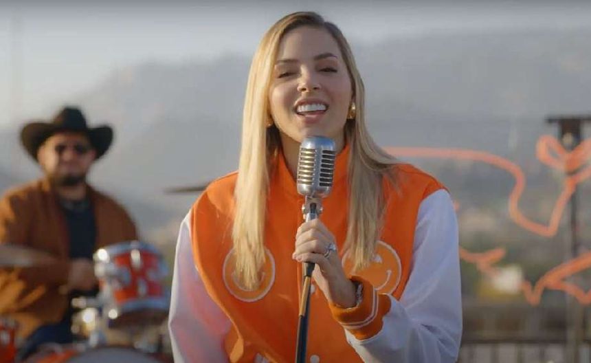 Al estilo de una cantante de música norteña, con una producción que envidiaría cualquier artista y con el Cerro de La Silla como fondo, la creadora de la frase ‘Fosfo, fosfo’ tomó el micrófono para interpretar un tema en el que habla de su amor a Monterrey.