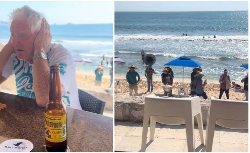 Un video viral en TikTok muestra a un hombre estadounidense mayor tapándose los oídos mientras escucha una banda en vivo en Mazatlán, Sinaloa. El clip ha generado reacciones debido a la visible irritación del turista por el alto volumen de la música.