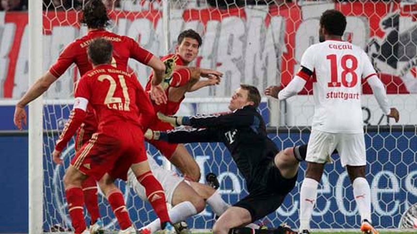 El delantero de ascendencia española Mario Gomez hizo los dos goles del Bayern para dar vuelta el marcador en un partido que el Stuttgart terminó con diez hombres.