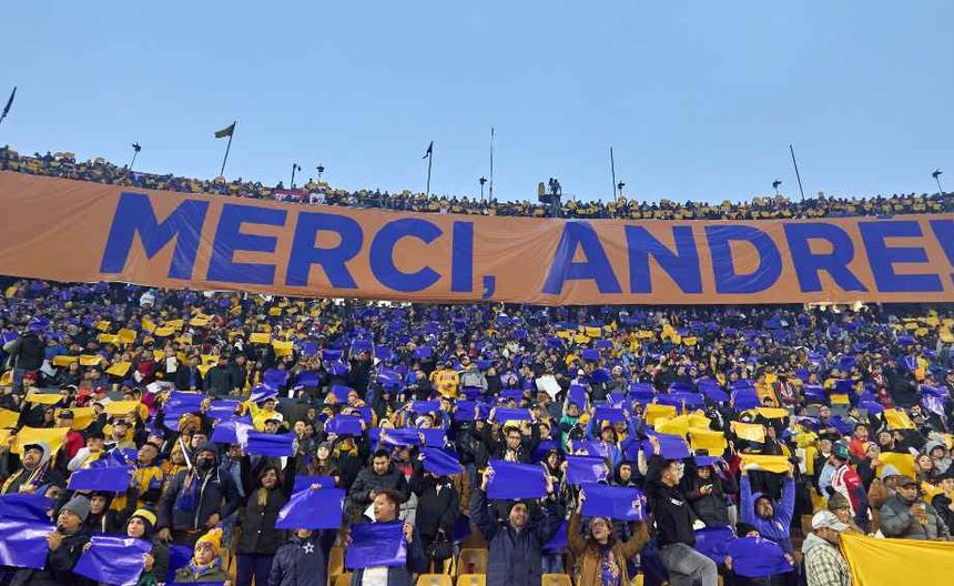 Ya cuando el partido estaba por comenzar, un gran tifo se desplegó en una de las cabeceras del Universitario, mostrando el número 200 con una imagen del francés y una manta con el mensaje “Merci, ¡André!”