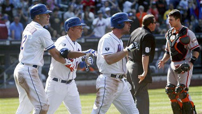 El panameño Rubén Tejada anotó el sábado la carrera de la victoria tras un error de lanzamiento del receptor Buster Posey y los Mets de Nueva York derrotaron 5-4 a los Gigantes de San Francisco después de desaprovechar una ventaja de tres carreras antes en uno de los más extraños novenos episodios.