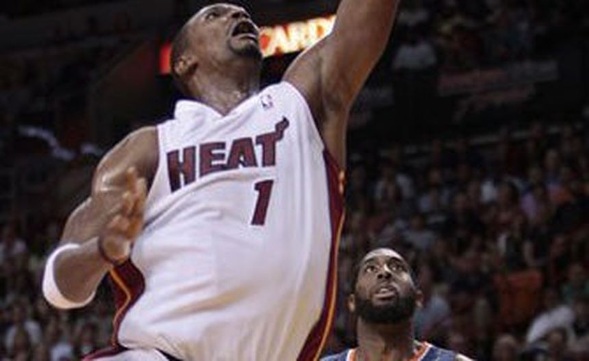 Chris Bosh anotó el domingo 20 de sus 24 puntos en la primera mitad, y el Heat de Miami tiene ahora una foja de 5-0 por primera vez en la historia del equipo tras arrollar 129-90 a los Bobcats de Charlotte.