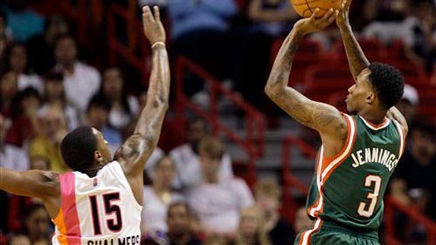 Brandon Jennings anotó el domingo 23 puntos, el suplente Ersan Ilyasova aportó 16 y los Bucks de Milwaukee obligaron al local Heat de Miami a convertir sólo 37% de sus tiros de campo para vencerlo por 91-82.