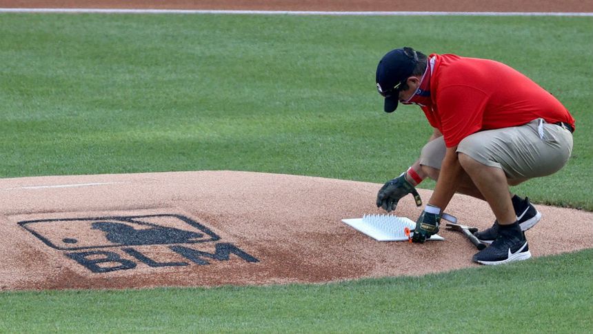 De igual forma, la base del montículo del pitcher lució con el logo de la Major League Baseball (MLB) con las iniciales BLM (Black Lives Matter).