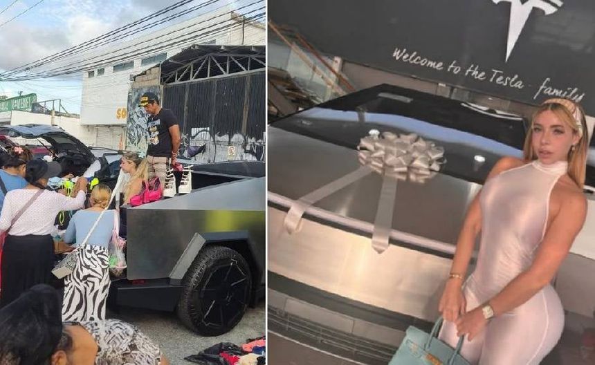 Modelo causa sensación en Cancún al vender ropa desde su Tesla Cybertruck en un tianguis