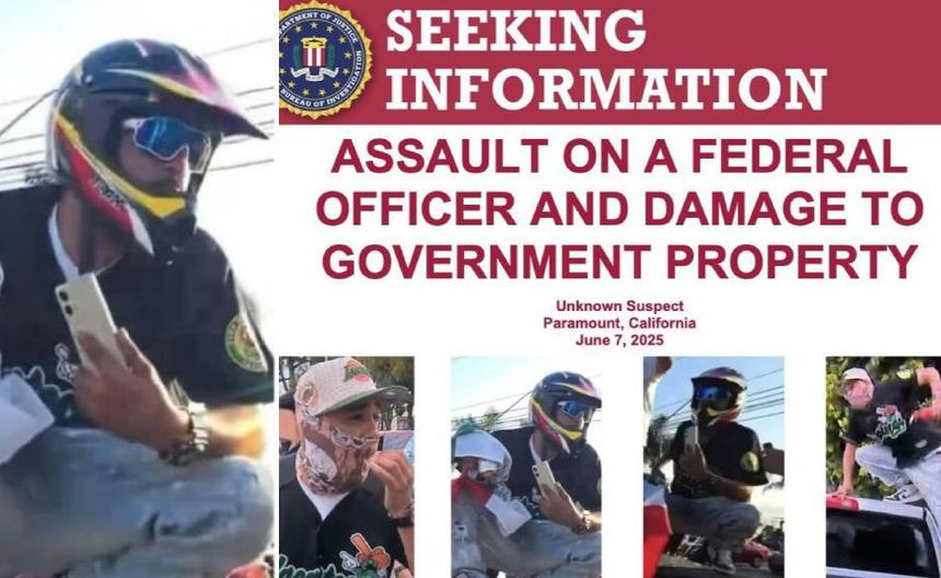 Entre los manifestantes destacó un hombre con casco de motocicleta, camisa negra, jeans azules, gorra blanca y tenis blancos, quien además de ondear una bandera de México, también lanzó piedras contra agentes del FBI, por lo que las autoridades de Estados Unidos han lanzado una alerta de “Se busca”, ofreciendo una recompensa de 50 mil pesos para quien dé pistas de su paradero.