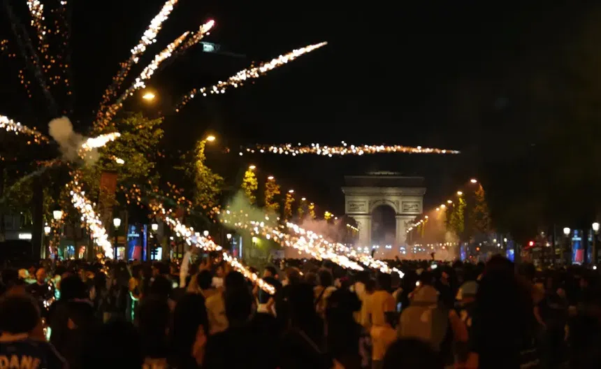 En la plaza de la Bastilla, hubo escenas de júbilo en las que los aficionados subieron a la base de la famosa columna, cantando, bailando y lanzando bengalas, mientras los que estaban alrededor se unían.