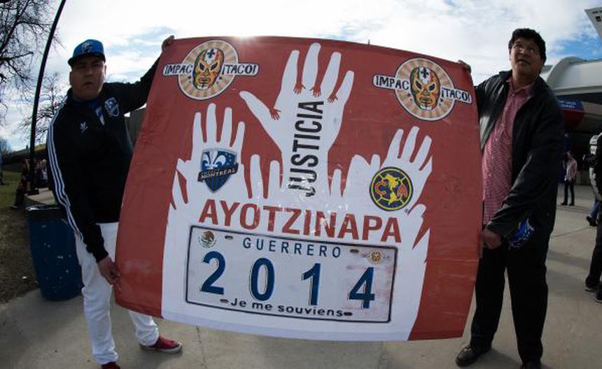Previo al encuentro entre Impact y América en Concachampions, algunos aficionados que asistieron al Estadio Olímpico de Montreal protestaron por el caso Ayotzinapa.