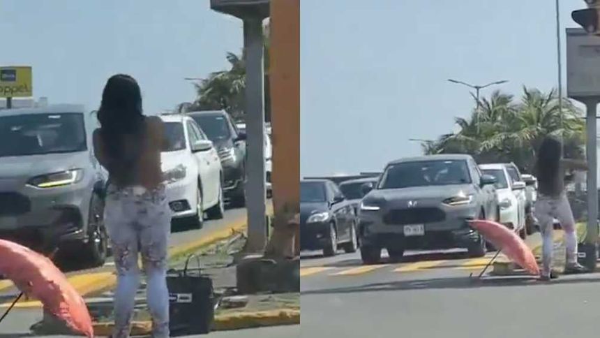 En redes sociales llama la atención que la mujer, de unos 25 años, se quita la ropa sin pudor alguno, por unos momentos parece que posa para los automovilistas detenidos por el semáforo en el cruce de Boca del Río Centro hacia Deportiva Hugo Sánchez, para luego con toda la calma del mundo ponerse su pantalón y la blusa.